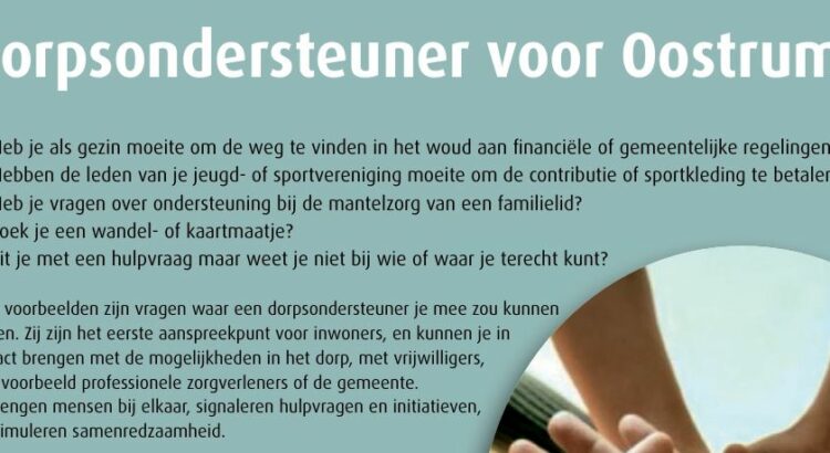 Wilt u hieraan deelnemen, neem dan contact op met Kees Spitters via kees@dorpsraadoostrum.nl of 06-22455963. We kunnen u dan vooraf meer informatie sturen, bijvoorbeeld modellen die laten zien hoe een dorpsondersteuner kan worden ingezet.