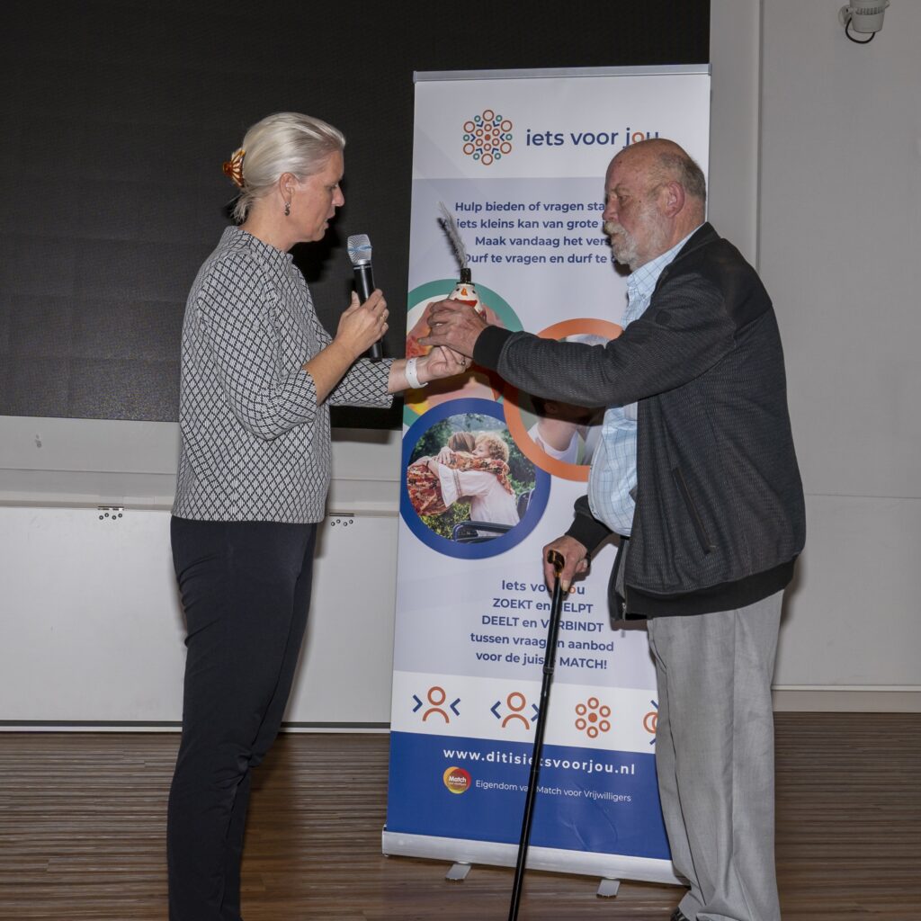 Voorgaande jaren was de uitreiking een avondvullend feest met drankjes en muziek. Vanwege corona was het nu een sobere bijeenkomst in de Raadzaal van het gemeentehuis. Maar samen met Martin Leenders van Match voor Vrijwilligers maakte wethouder Nijnkerken-De Haan er een persoonlijke ceremonie van. Ze vroeg iedereen apart op het podium voor een persoonlijk woord. Daarna kreeg de genomineerde zijn oorkonde en een Pluum: een handgemaakt beeldje met een veer erin. Die van Sraar komt naast zijn computer te staan.