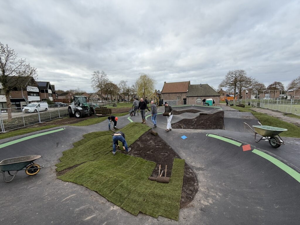 Afgelopen zaterdag 28 februari heeft een grote groep van 14 vrijwilligers, gewapend met harken en kruiwagens, 450 m2 aan graszoden gelegd. Nu moet het gras zich hechten. We willen daarom met klem vragen om buiten de bouwhekken te blijven! Zorg er svp voor dat kinderen niet op het terrein komen, om schade aan het gras te voorkomen. Bovendien moet de baan nog worden gekeurd door een onafhankelijke keuringsinstelling om een keurmerk te krijgen als veilig speeltoestel. Daar kan een paar weken overheen gaan, maar in die tijd kan het gras mooi wortel schieten.